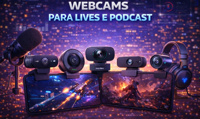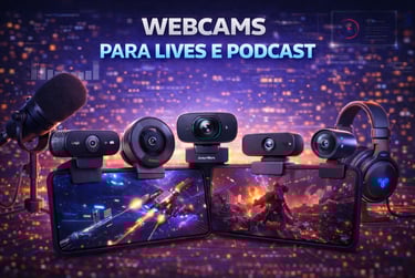 Descubra quais webcams são ideais para lives e podcasts em 2026, desde opções mais acessíveis até modelos profissionais. Entenda o que realmente importa em resolução, taxa de quadros, microfone e iluminação para ter uma imagem nítida e um visual mais profissional nas suas transmissões.