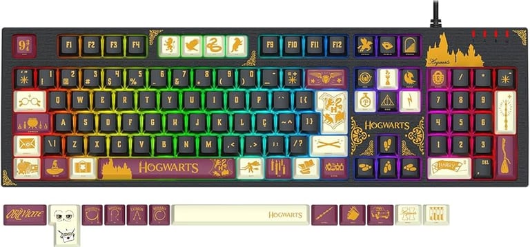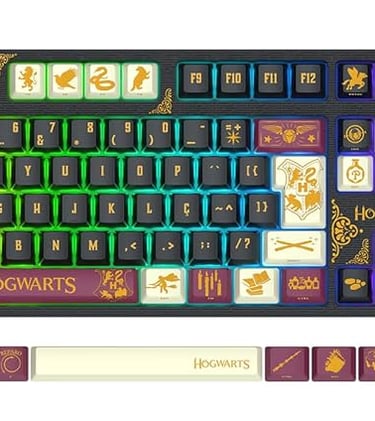 O fone de ouvido da linha combina som imersivo com um design temático: pressas e conchas recebem núcleos e símbolos de Harry Potter, enquanto o acolchoamento oferece conforto para longas sessões de jogo ou maratonas de filmes. O teclado chega com iluminação em RGB personalizável, keycaps estilizados e acabamentos que lembram pergaminhos, brasões e núcleos das casas, criando uma experiência visual que transforma a mesa em um cenário de Hogwarts.